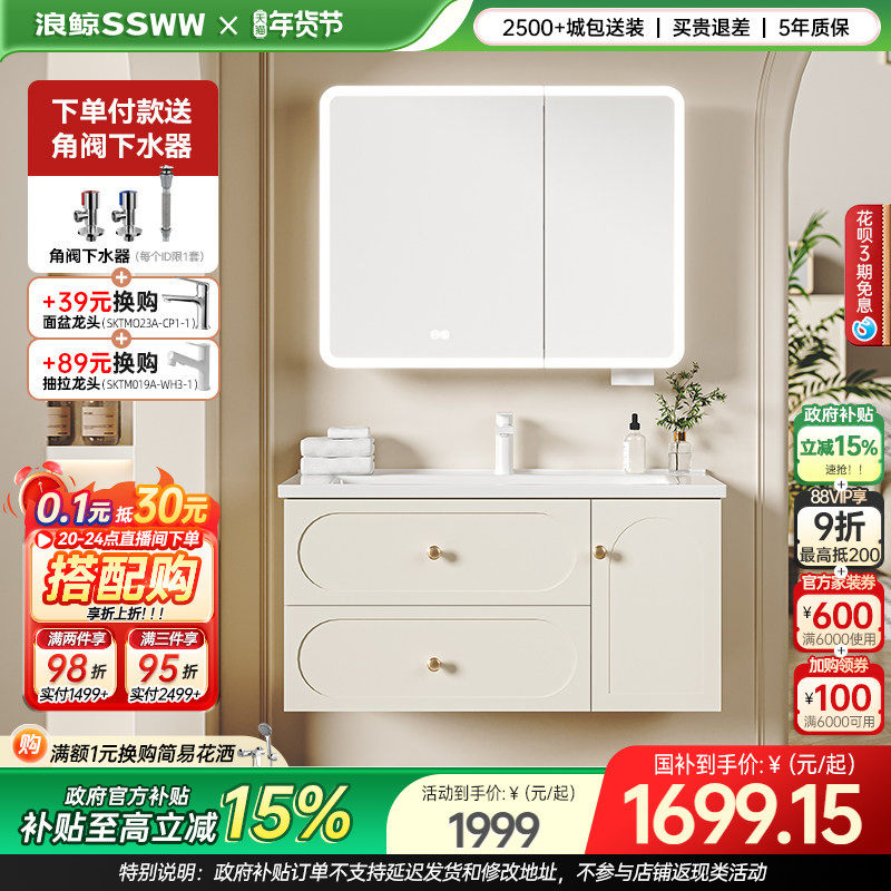 浪鲸浴室柜组合奶油风一体盆美妆镜柜小户型洗脸盆洗手池组合0030