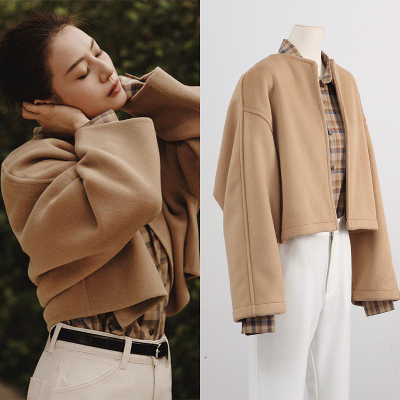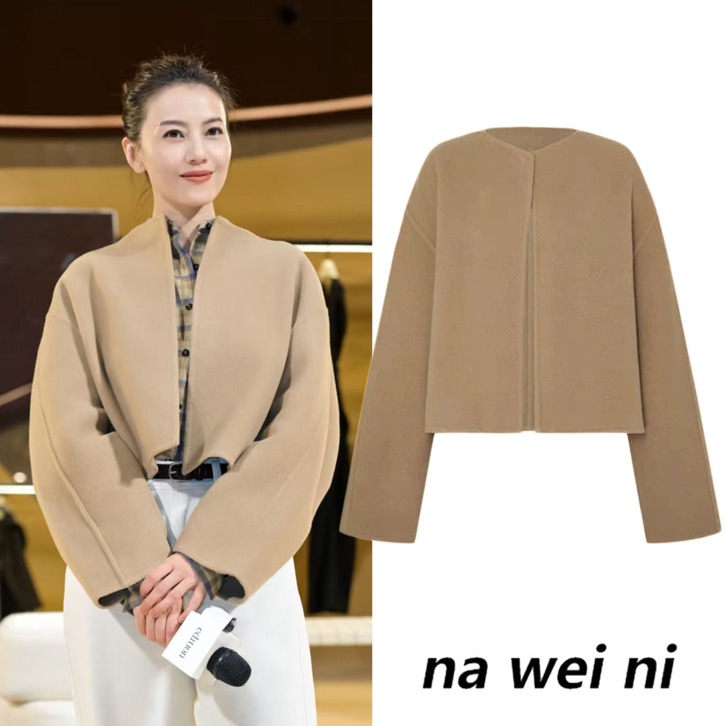 高圆圆同款驼色短款羊毛毛呢开衫外套女秋冬廓形宽松气质呢子大衣