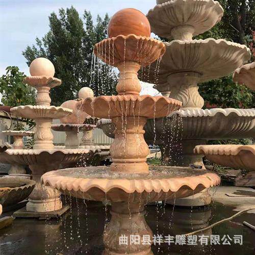 石雕喷泉庭院户外黄锈石大型流水欧式水钵景观别墅晚霞红喷水摆件
