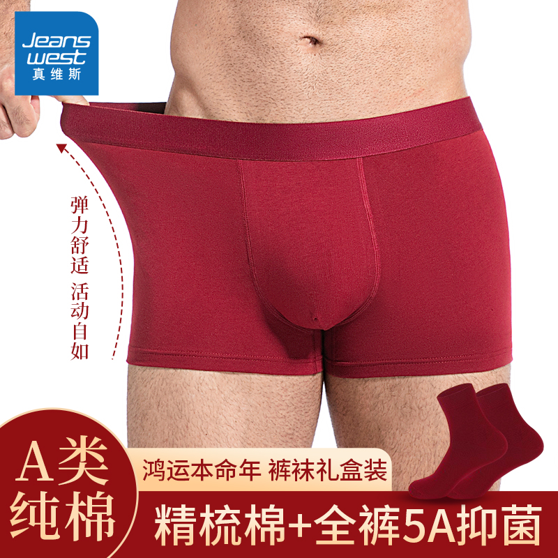红豆男士红色内裤纯棉抗菌裆本命年蛇马结婚礼物袜子平角短裤礼盒