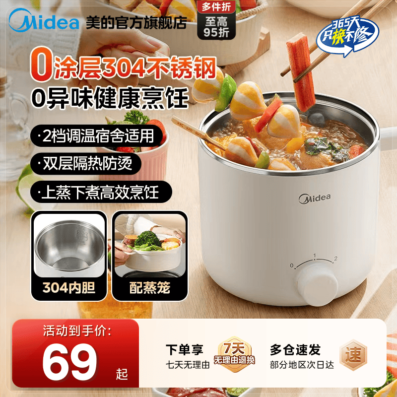 美的电煮锅304不锈钢0涂层宿舍煮面锅多功能电火锅家用小型电煮锅