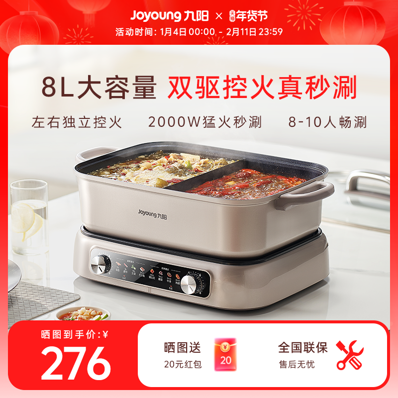 九阳双区秒涮电热火锅专用锅多功能鸳鸯火锅家用8升大容量不沾锅
