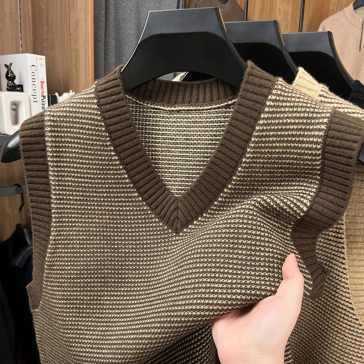 休闲款秋冬季毛织背心马甲中青年男V领针织毛衣无袖宽松羊毛衫男