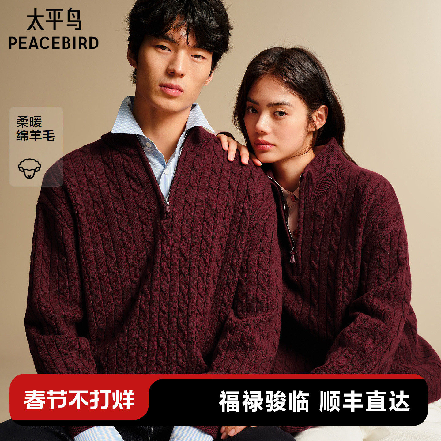 太平鸟男装 休闲毛衫26春时尚新款经典绞花半拉链含羊毛宽松毛衣