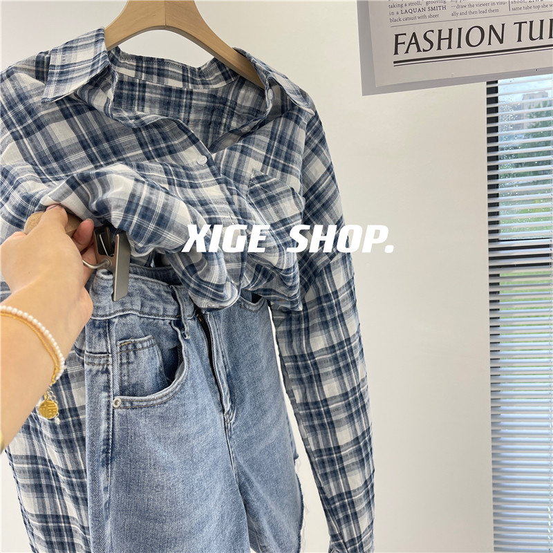 格子衬衫女早秋薄款2021新款纯棉蓝白格纹宽松男友风显瘦中长衬衣