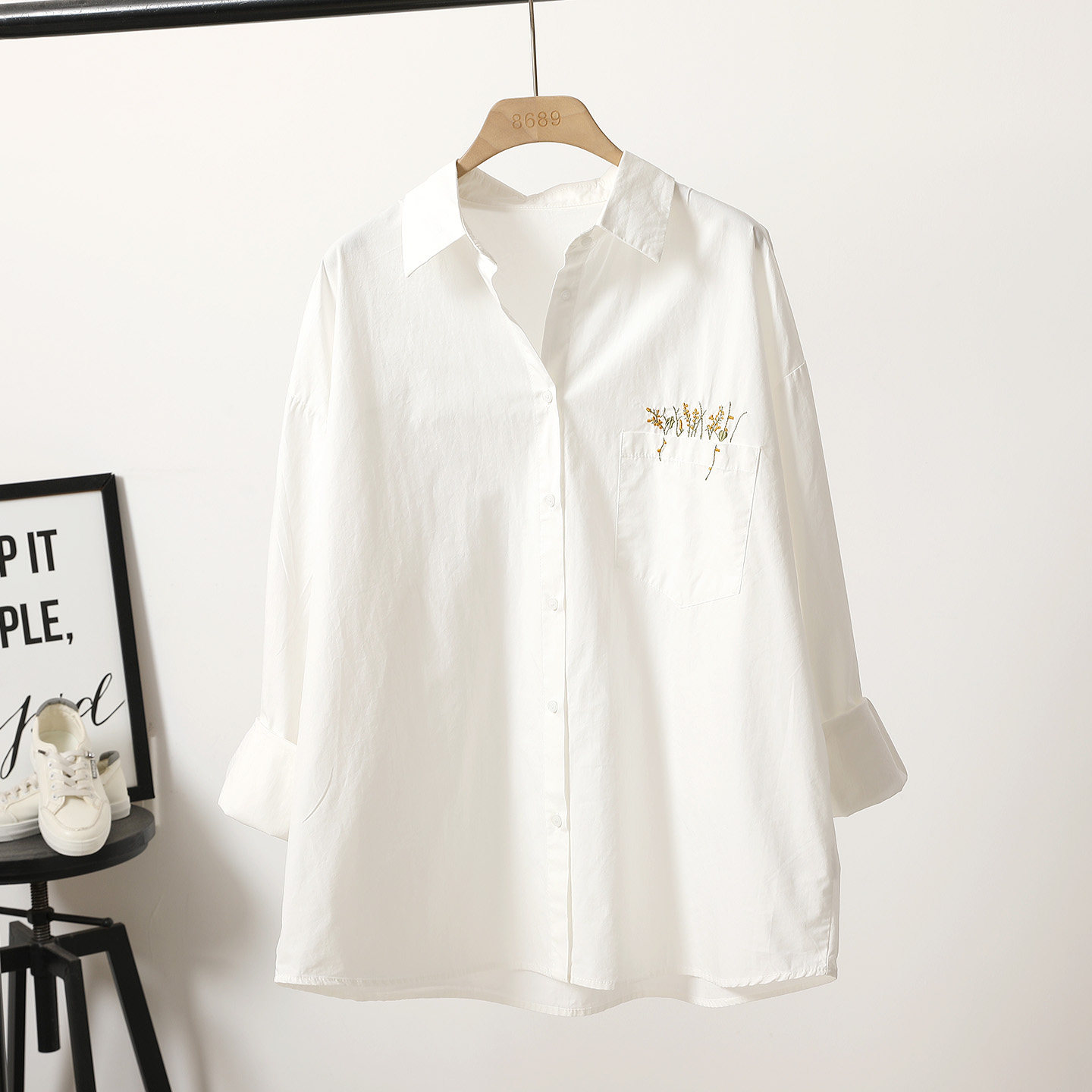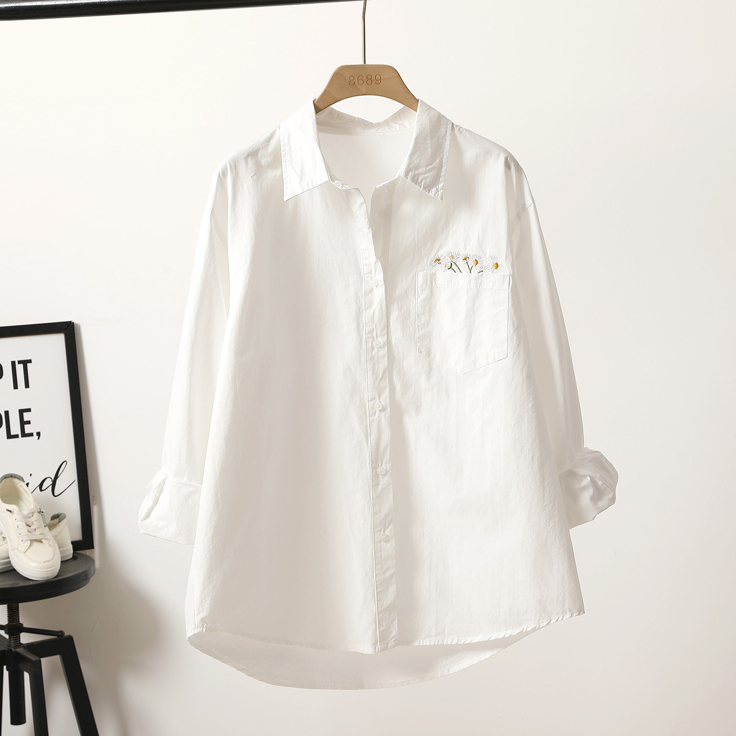 精致刺绣雏菊单口袋中长款纯棉白衬衫女2026春季新款宽松外穿上衣