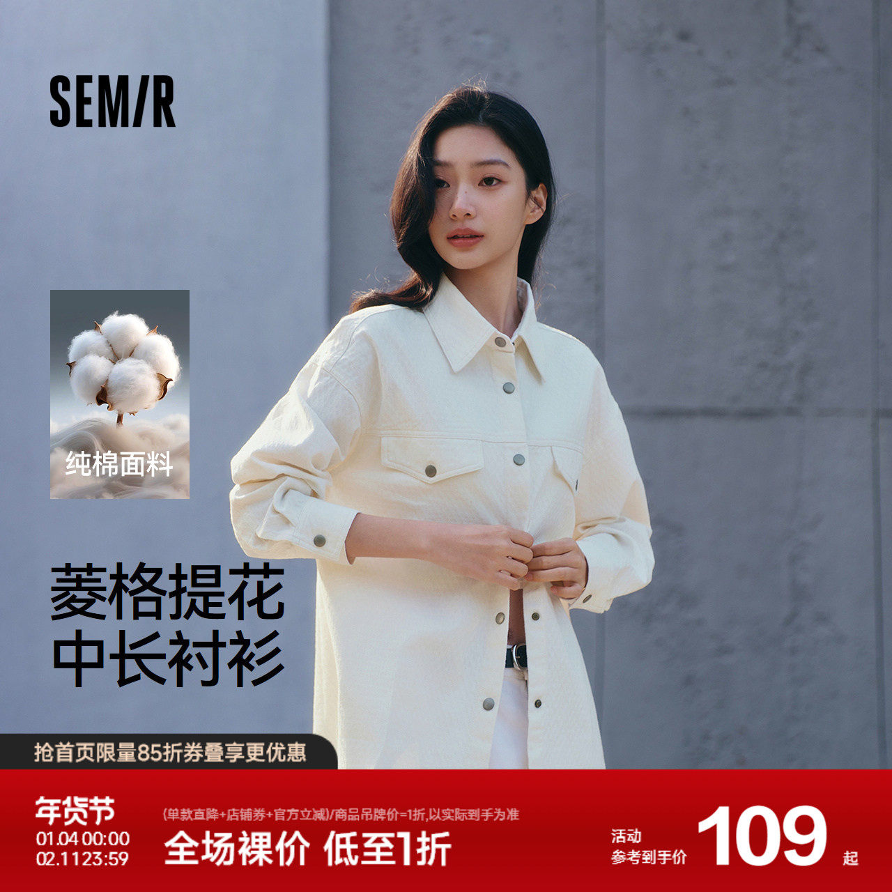 森马长袖衬衫女春中长款菱形格纯棉oversize白色提花肌理通勤衬衣