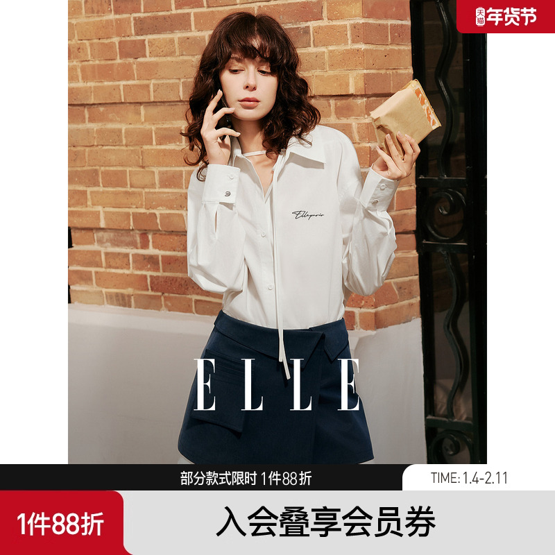 ELLE白色纯棉宽松中长款翻领衬衫女2025夏季新款时髦小众小衫外套