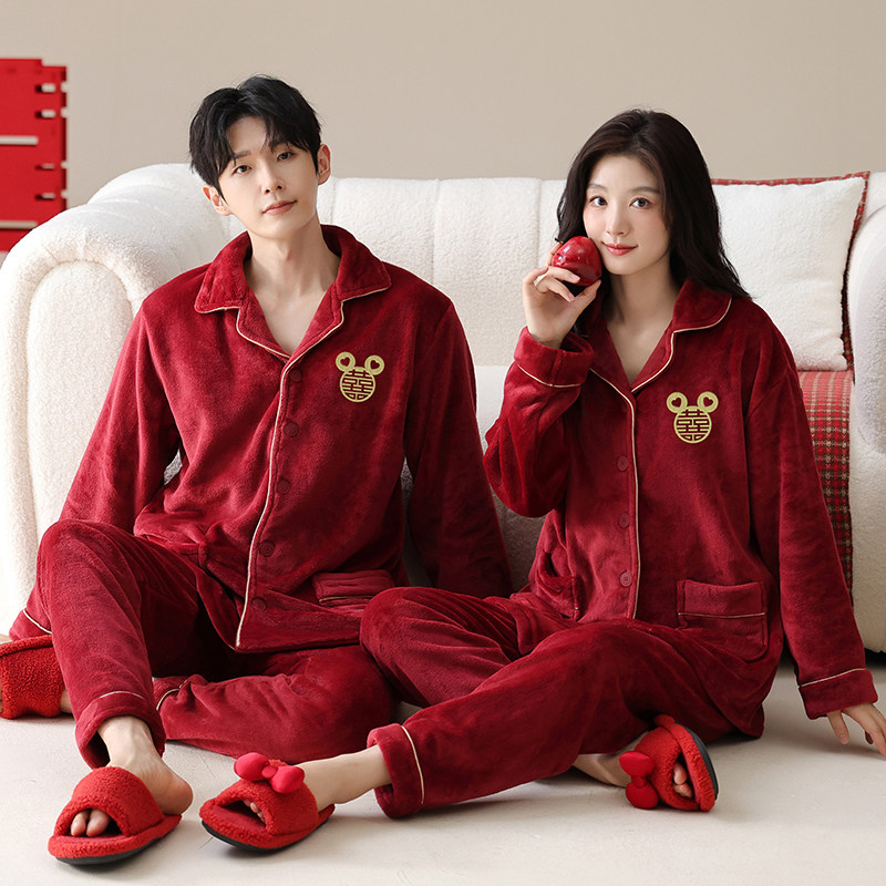 2026新款冬季加厚珊瑚绒情侣睡衣红色新婚结婚保暖开衫家居服套装