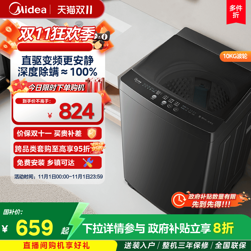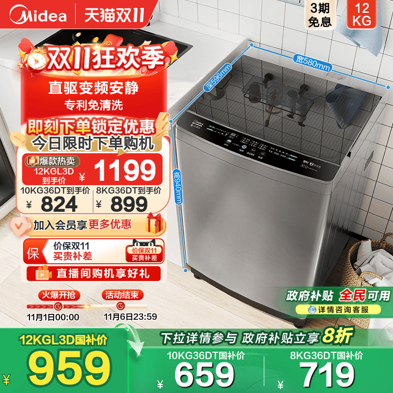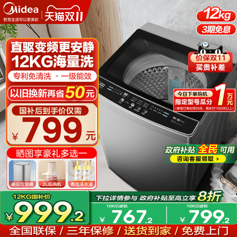 [全民补贴]美的直驱变频12/10/8kg全自动家用大容量波轮洗衣机