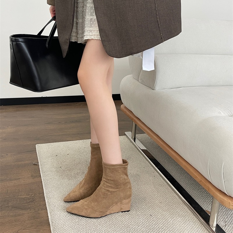 2025秋冬新款小个子内增高坡跟短靴韩版气质弹力靴尖头百搭瘦瘦靴