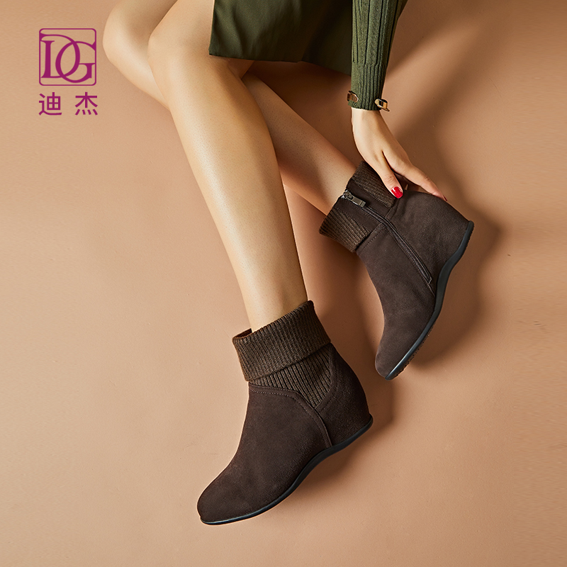 小众设计内增高坡跟短靴女2025年新款方头后拉链绒面及踝靴弹力靴