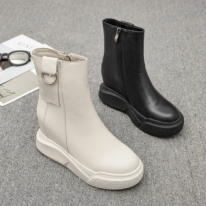 2025秋冬季短靴 平底中筒单靴 内增高米白色全真皮女靴子加绒坡跟