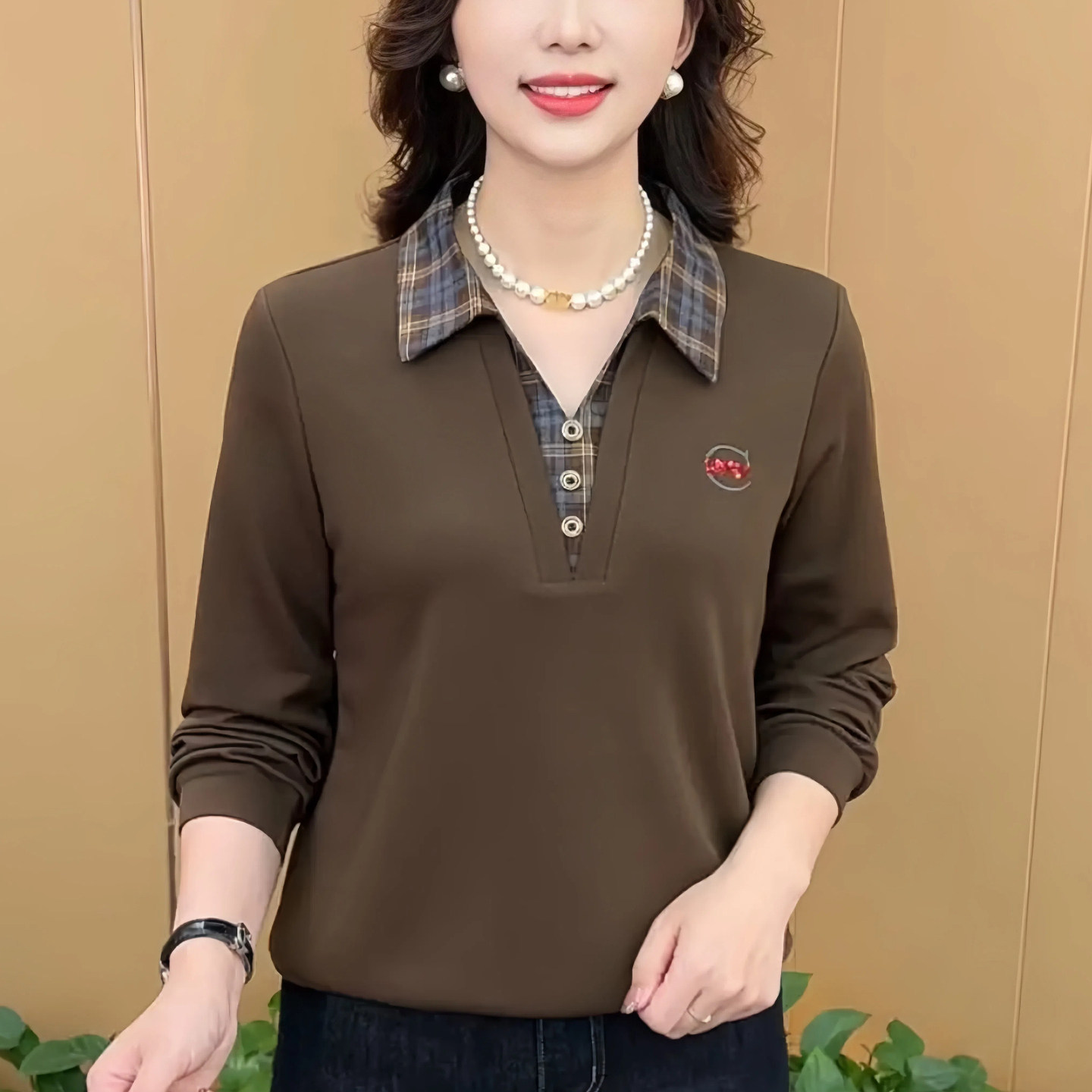 2026秋季新款时尚妈妈装假两件翻领长袖T恤百搭休闲女装减龄上衣