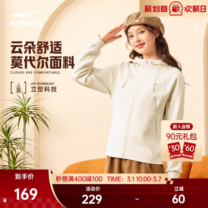 鸿星尔克外套女春季女士针织连帽开衫卫衣修身运动服休闲女装上衣