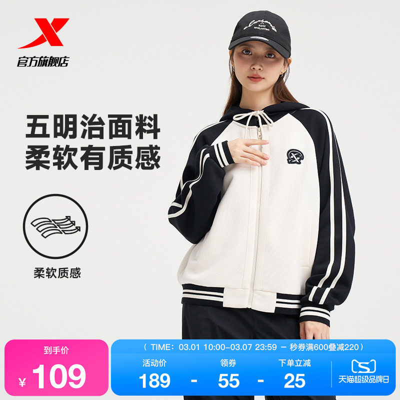 特步外套女士冬季新款柔软针织连帽运动上衣时尚休闲女装百搭夹克