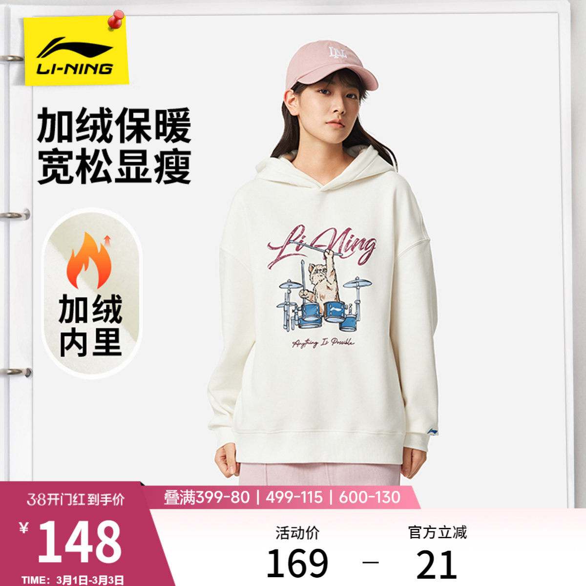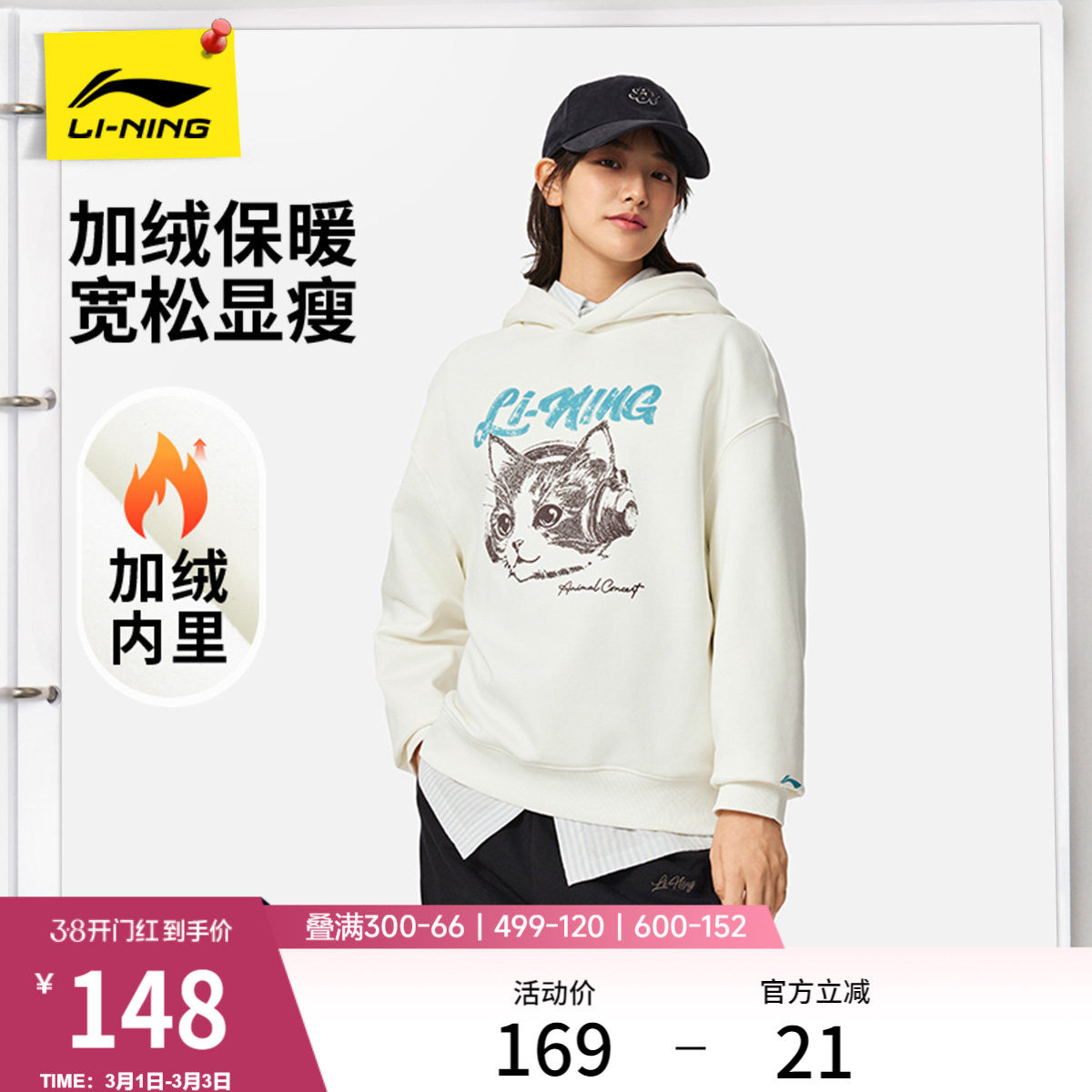 李宁卫衣女款官方新款休闲女装宽松帽衫连帽印花上衣长袖运动服女