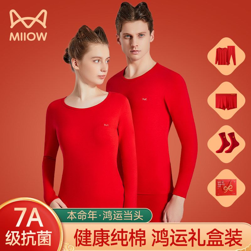 猫人本命年秋衣秋裤男女士套装2026马年纯棉加绒加厚红色保暖内衣