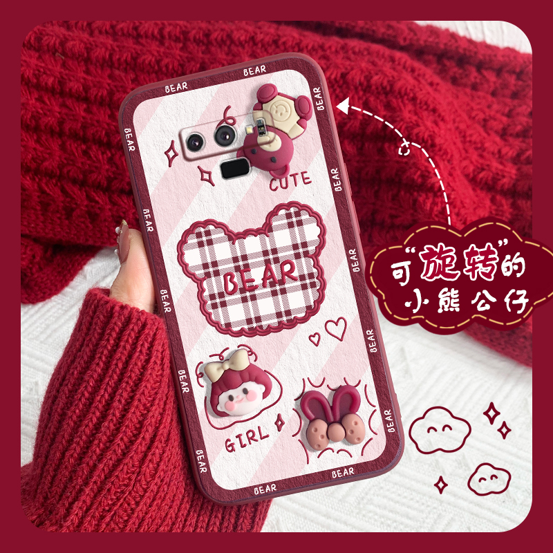 适用于三星note9手机壳note10旋转小熊note10+液态硅胶NT10可爱公仔女款SM-NT9防摔直边Samsung酒红4g保护套