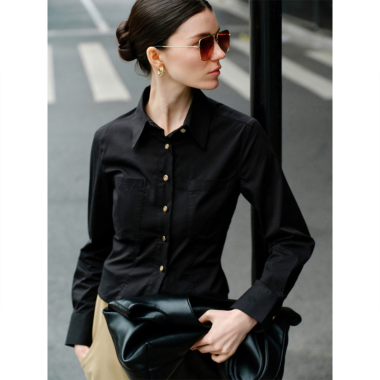 Navigare意大利小帆船长袖黑色衬衫女通勤职业女装百搭休闲衬衣