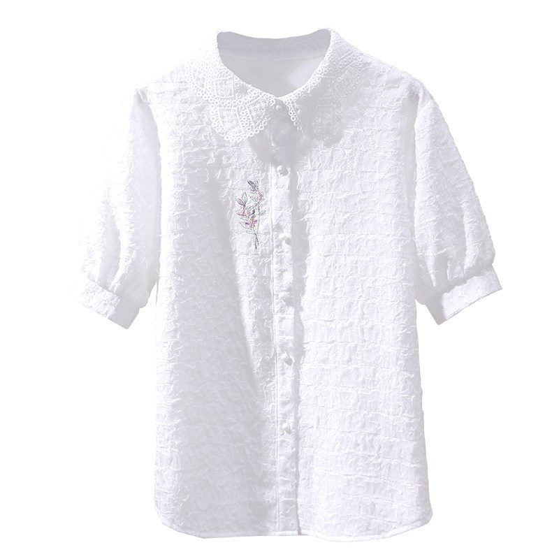 2024夏季新款雪纺衬衫女小众清新蕾丝拼接POLO领上衣短袖衬衣小衫