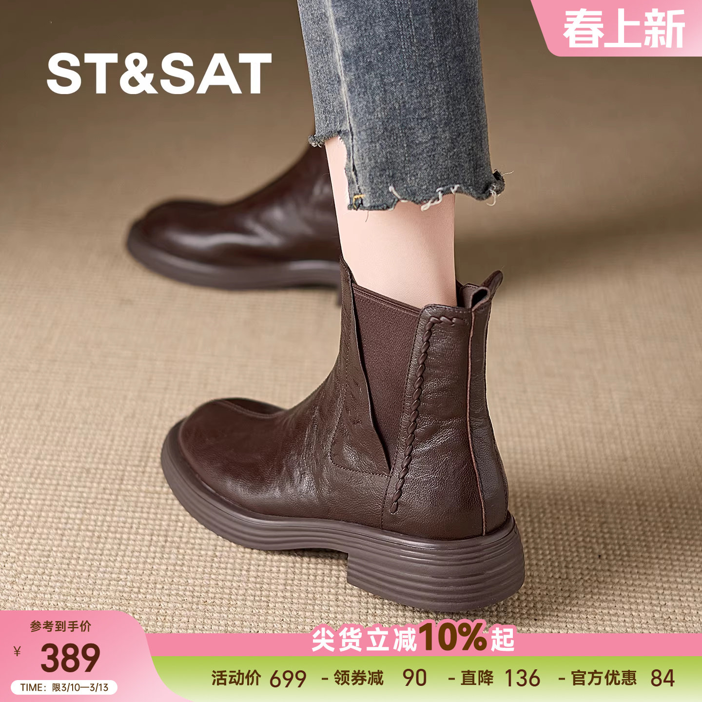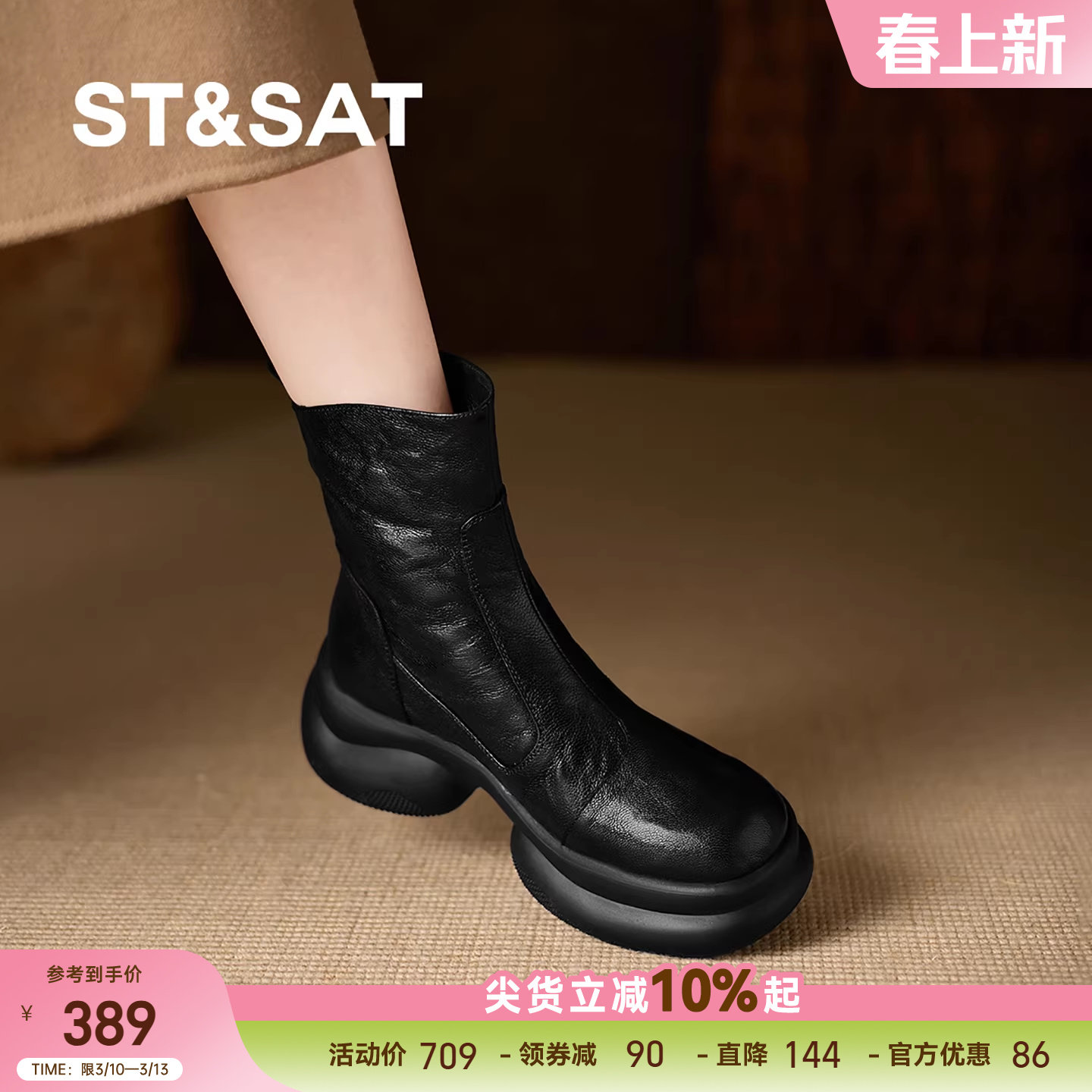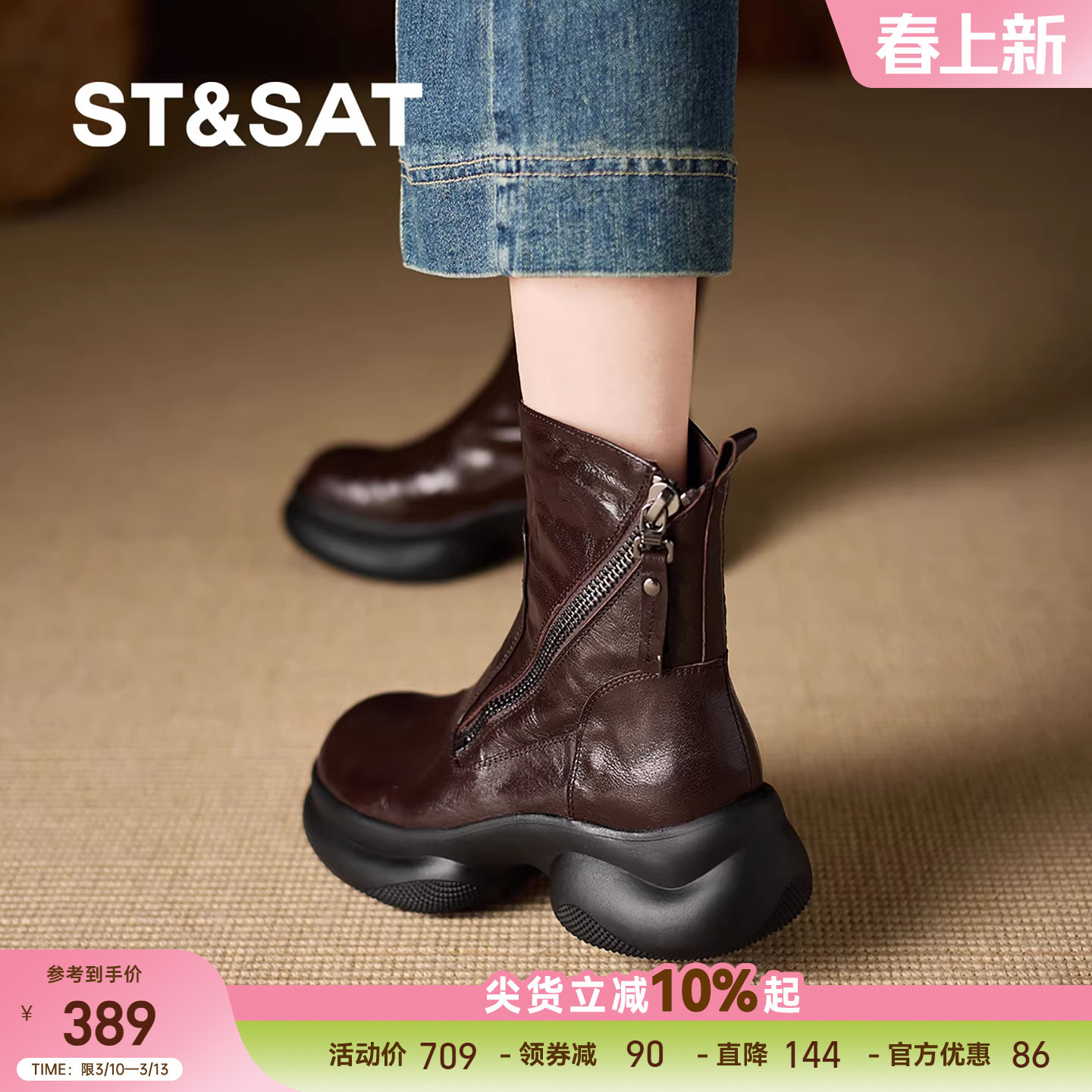 星期六2025秋冬真皮厚底短靴女棕色小个子马丁靴明星同款加绒棉靴
