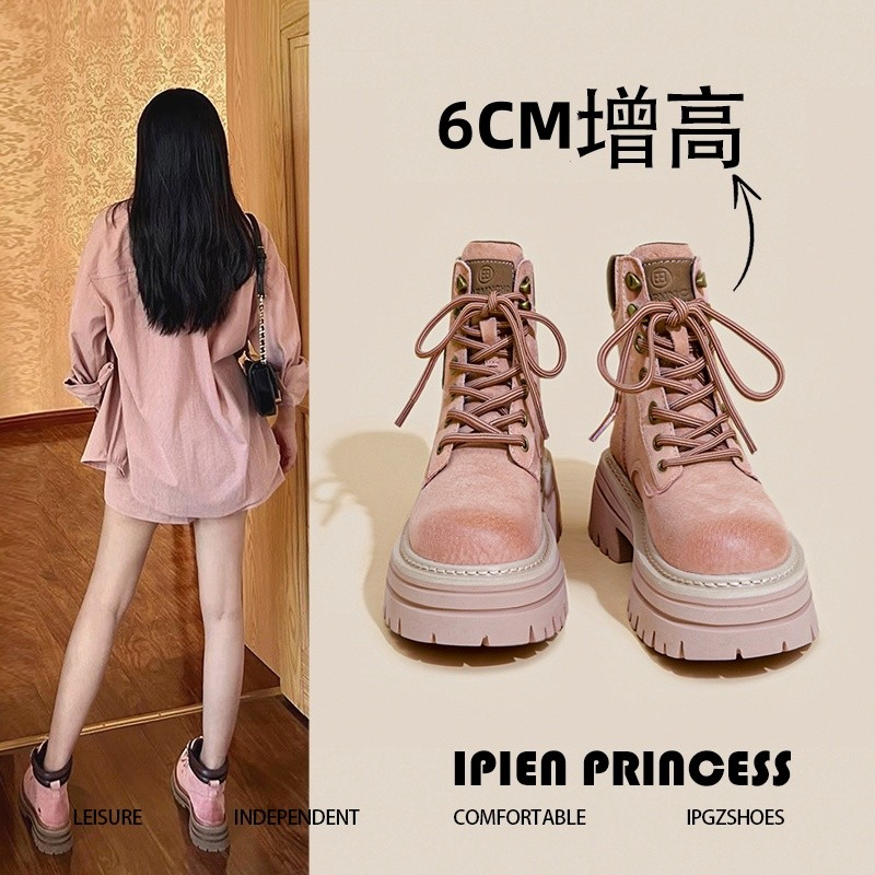 【明星同款】厚底马丁靴女款春秋新款小个子高级感粉色内增高短靴