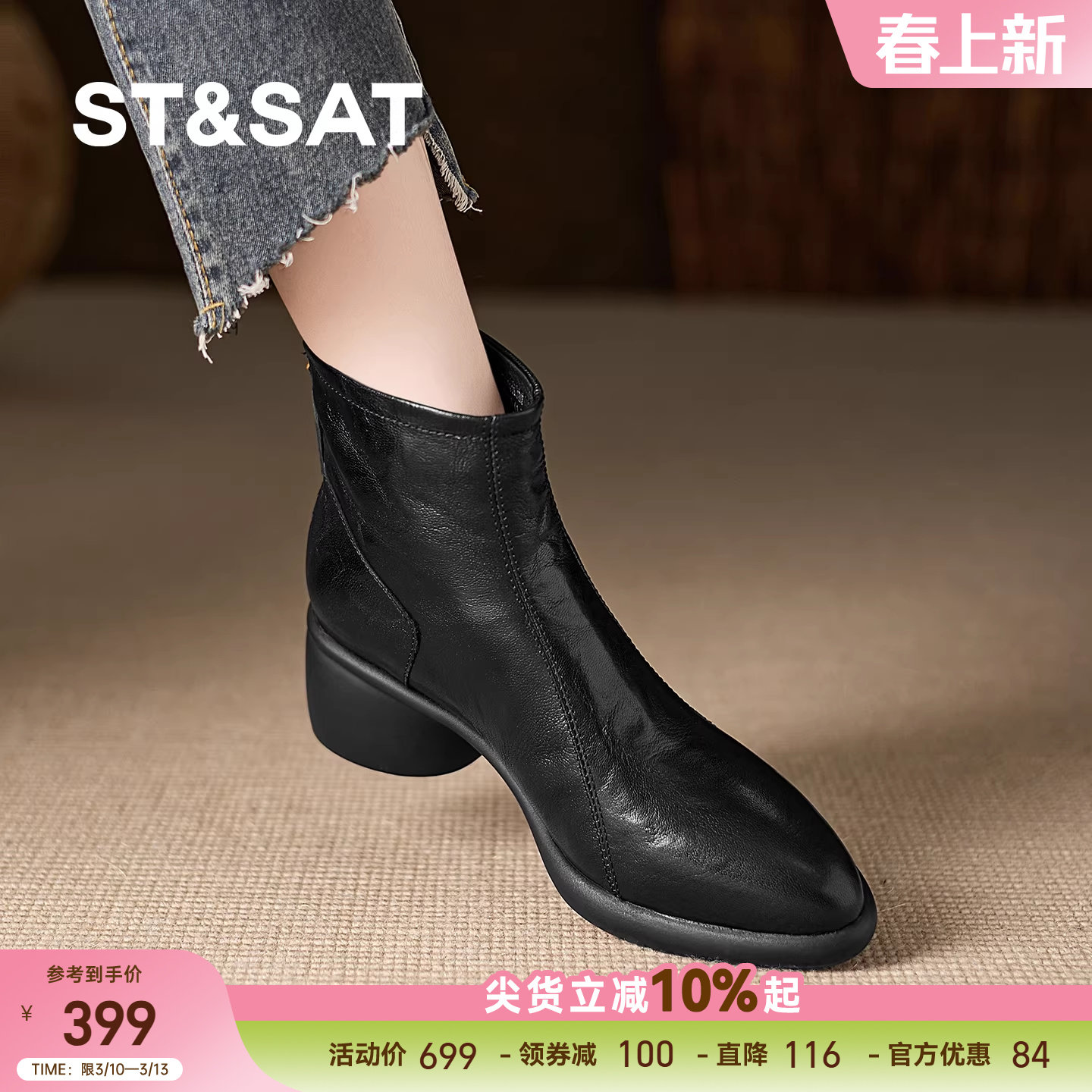星期六明星同款女靴子2025冬季新款加绒短靴女粗跟黑色尖头马丁靴