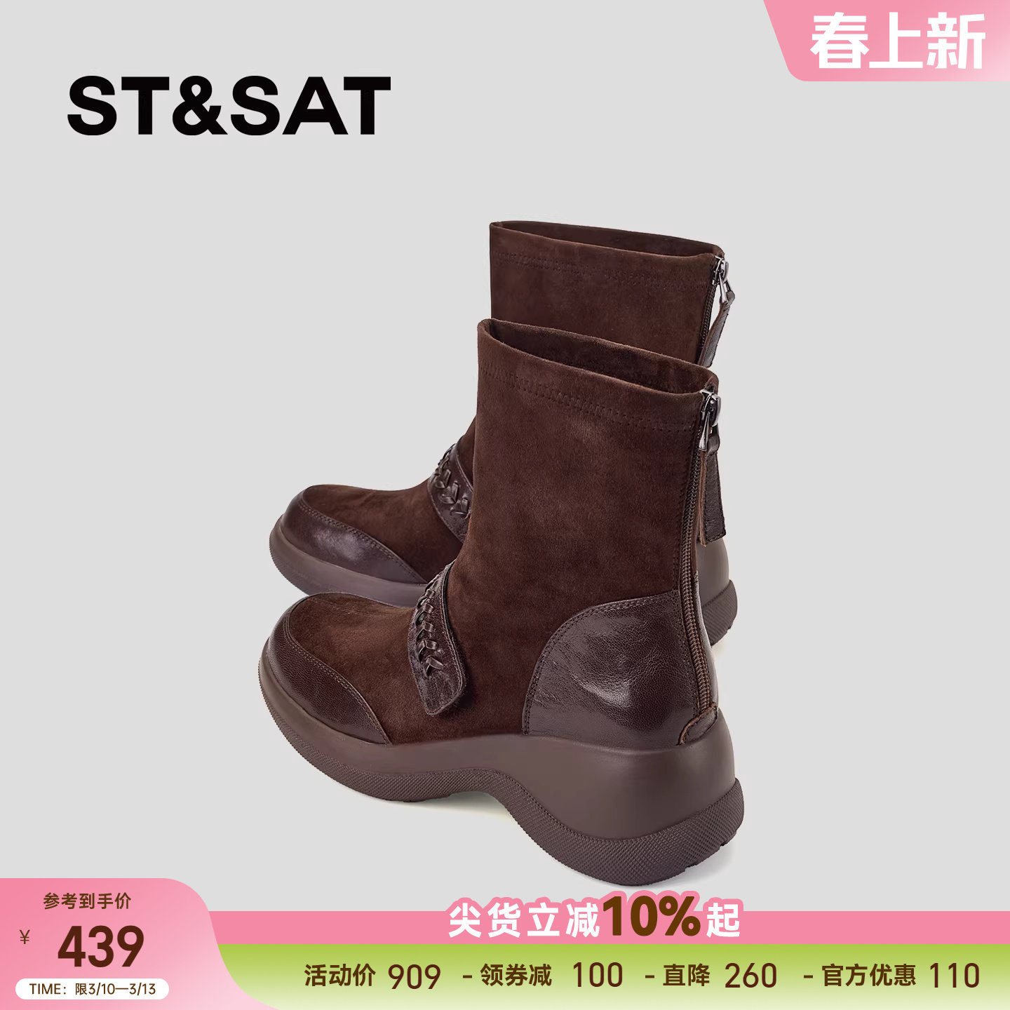 星期六明星同款真皮靴子女棕色厚底加绒短靴2025冬季新款马丁靴潮