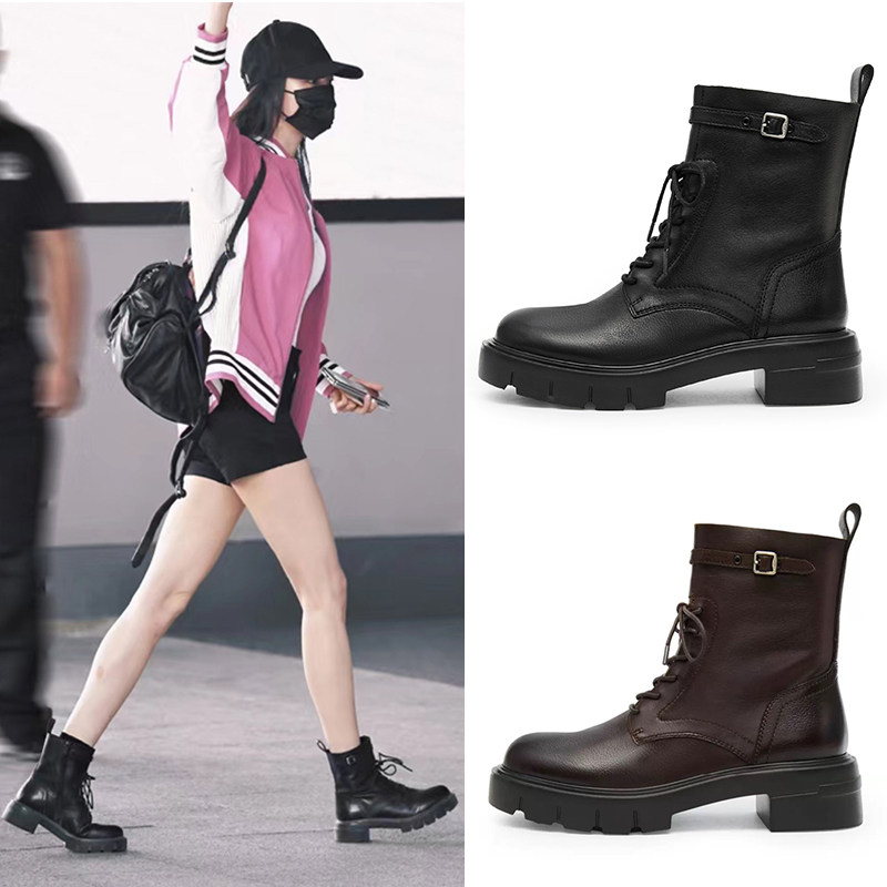中餐厅章若楠同款鞋真皮厚底马丁靴2026英伦高帮小皮鞋系带女短靴