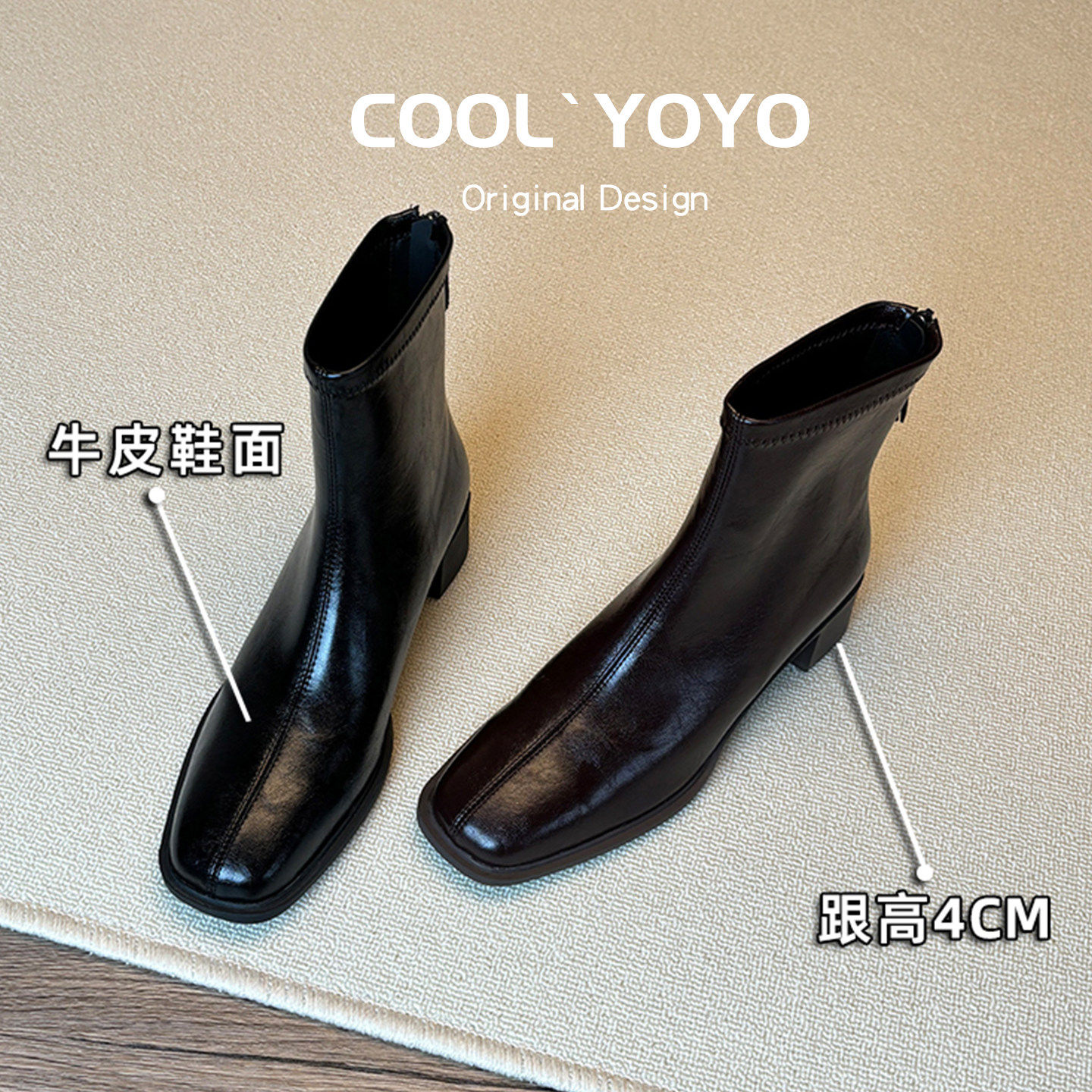 [明星同款]法式真皮粗跟小短靴女2026秋冬新款方头马丁靴加绒高跟