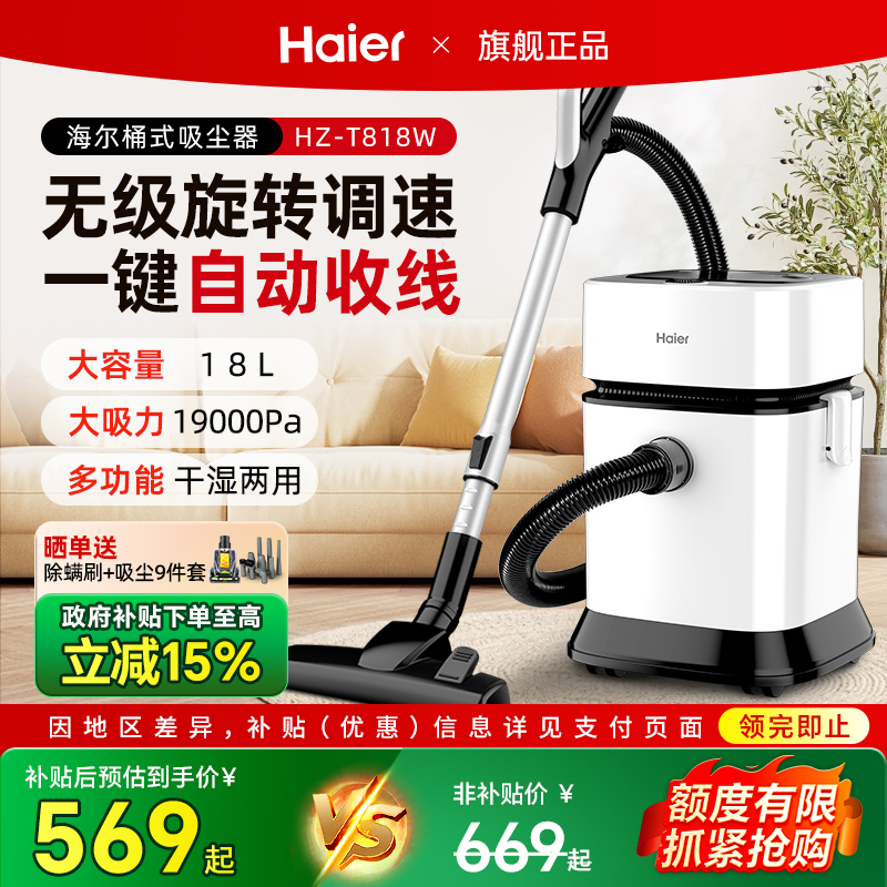 海尔吸尘器家用大吸力干湿两用强力大功率小型桶式装修猫毛吸尘机