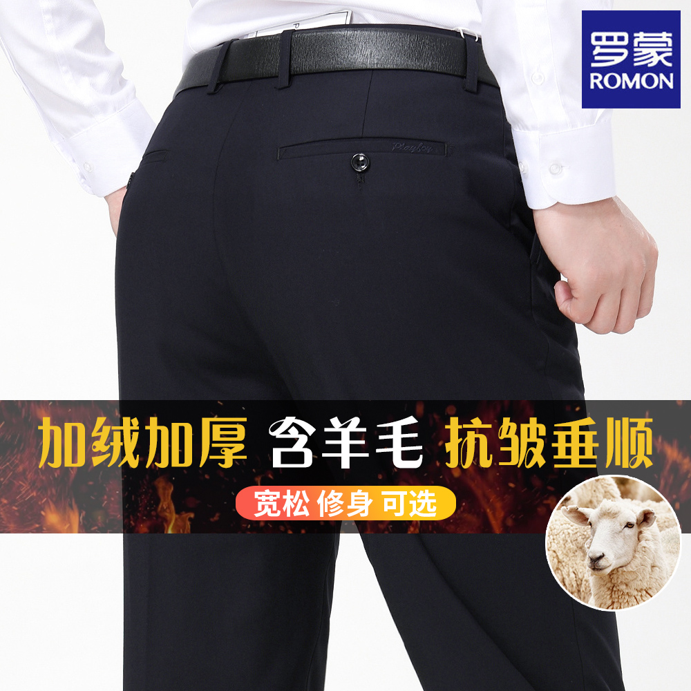罗蒙加绒加厚羊毛西装裤男秋冬免烫新款商务直筒宽松大码保暖男裤