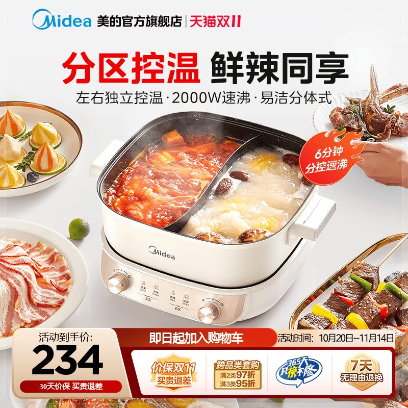 美的超薄速沸电火锅家用锅分体式分控鸳鸯锅多功能锅大容量电煮锅