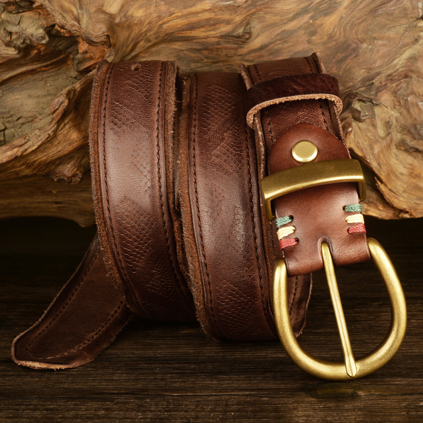 啄木鸟牛皮皮带男真皮青年腰带休闲针扣头裤带男纯手工真皮层压花