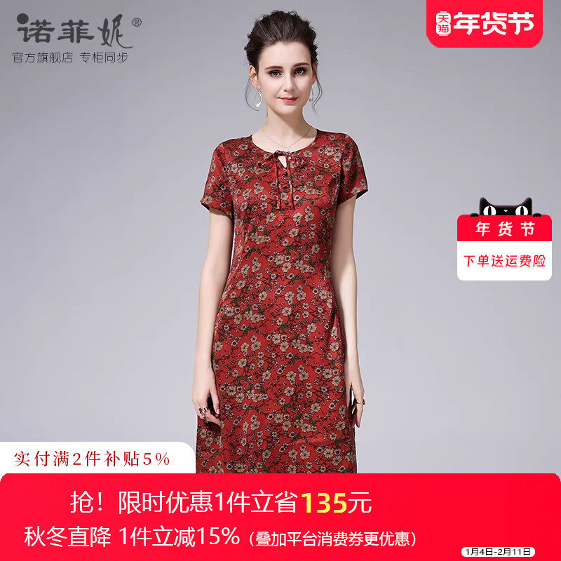 品牌女装夏装新款中年妈妈印花莨绸香云纱真丝连衣裙桑蚕丝中裙女