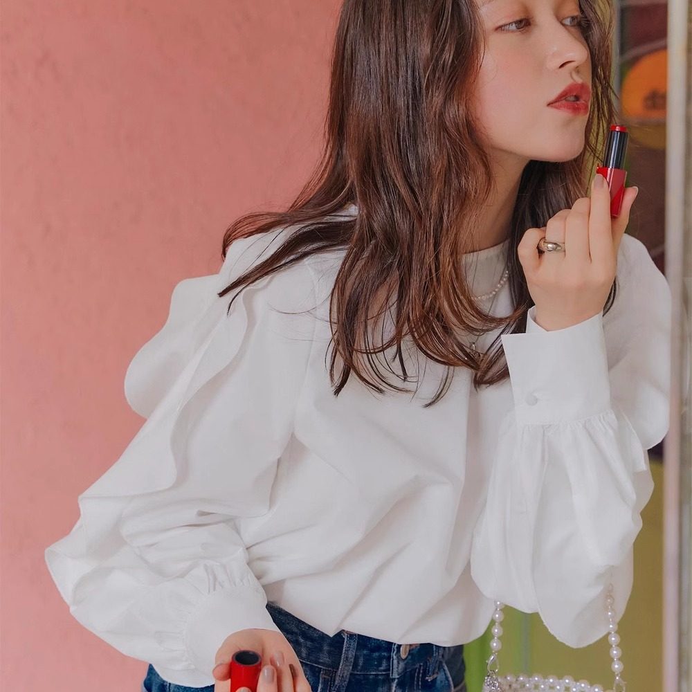 " 优雅淑女气息 " 清冷娇俏荷叶蝴蝶灯笼袖 圆领宽松衬衫上衣罩衫