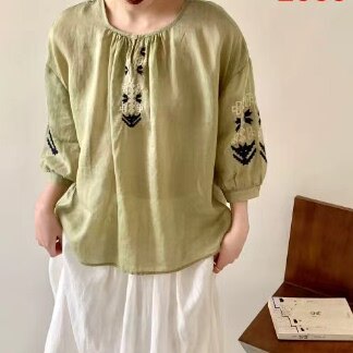 小莲~22936重工刺绣灯笼袖圆领苎麻小衫满身彩绣宽松水滴袖上衣女