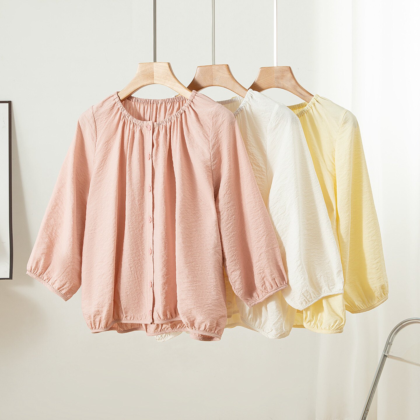 D23001日单春夏款单排扣圆领宽松显瘦女通勤气质褶皱灯笼袖衬衫