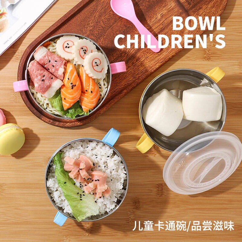 可爱儿童吃饭碗带盖勺萌萌宝宝防摔餐具小孩子卡通佩琦双柄不锈碗