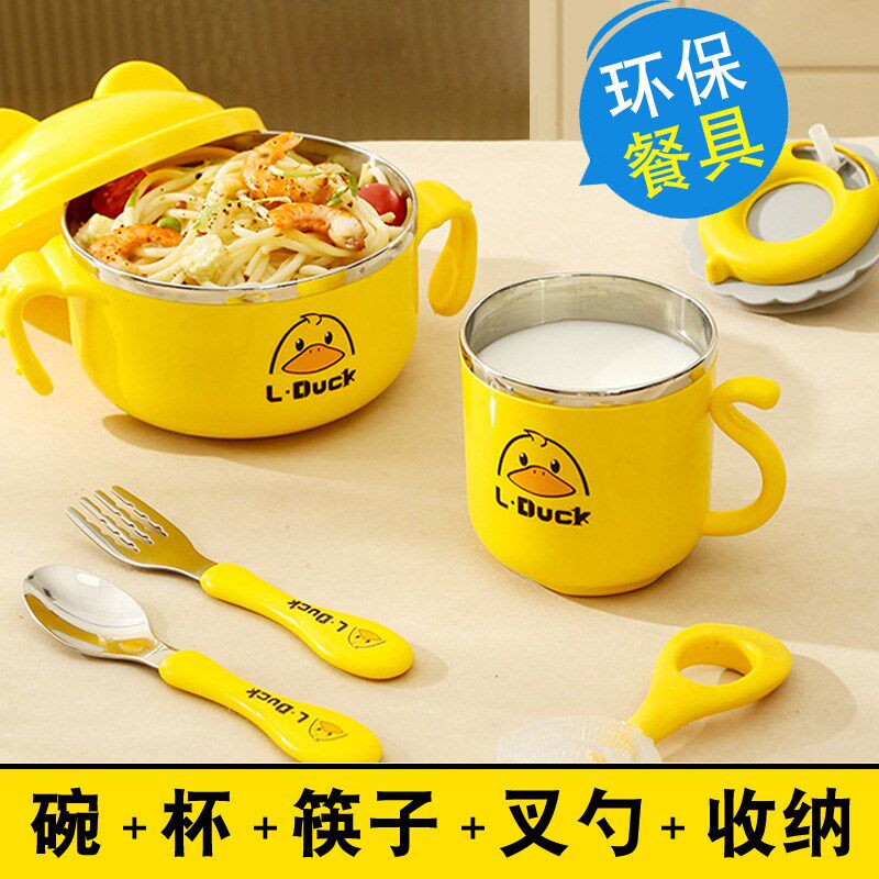 黄鸭儿童餐具套装礼盒不锈钢304宝宝学吃饭训练婴U儿小孩子辅食碗