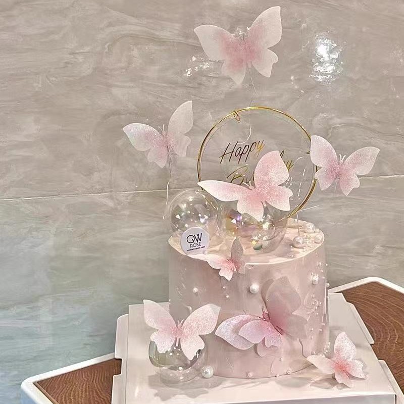2024网红粉色糯米纸蝴蝶蛋糕装饰摆件女神生日圆形亚克力派对插件