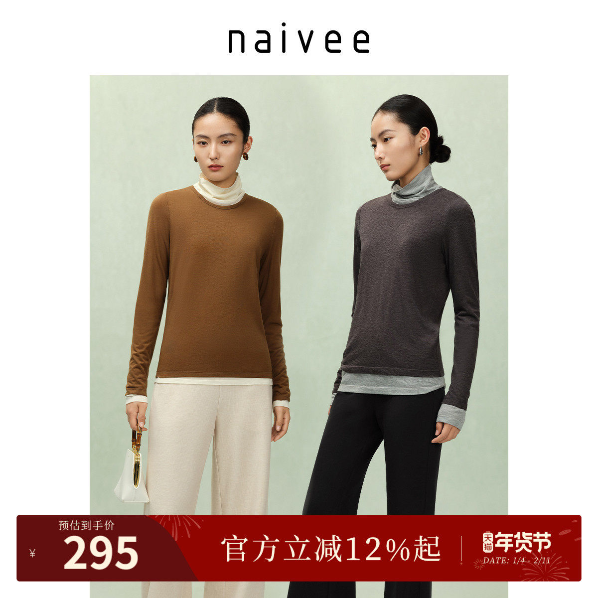 纳薇2025秋冬新款高领叠穿假两件打底衫女内搭天丝羊毛修身肌底衣
