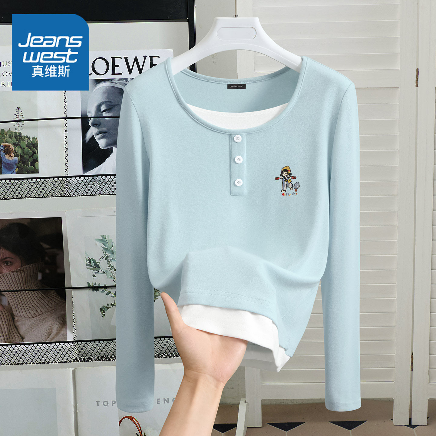 班尼路S&K系蓝色假两件打底衫女内搭2025秋季新款u领纽扣长袖t恤H