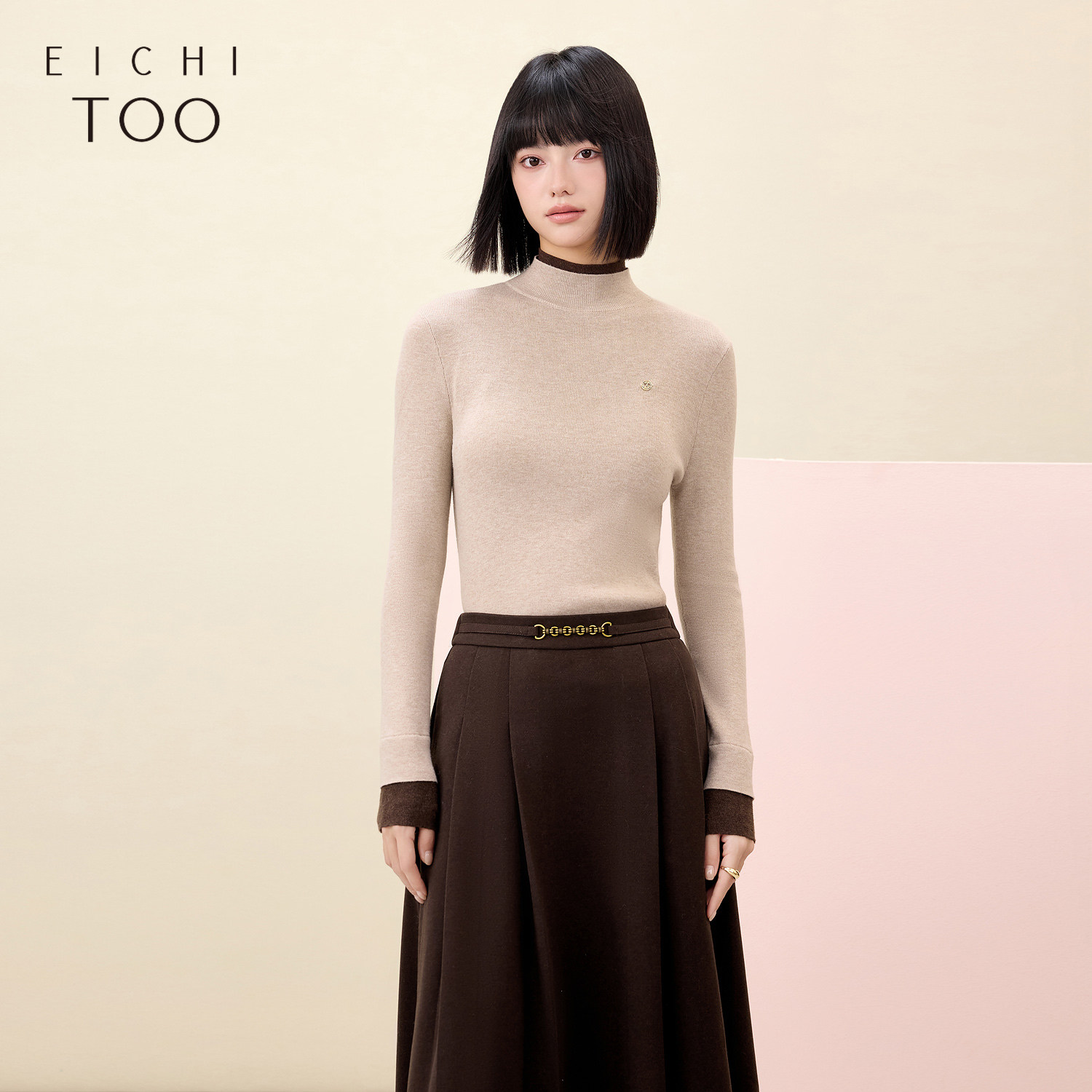 龙妹家杏色高领假两件打底衫女内搭毛衣2026新款春季穿搭针织上衣
