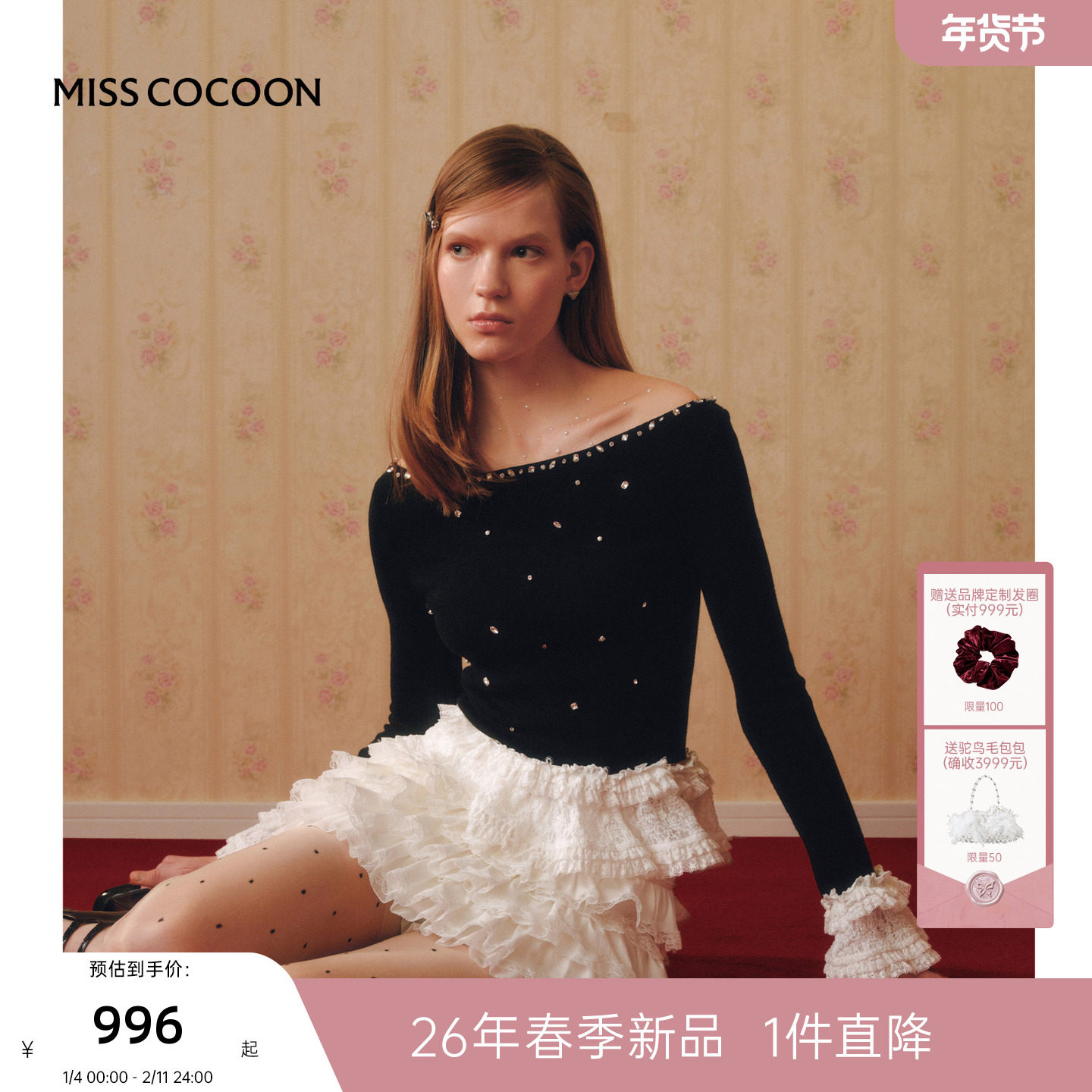 MISSCOCOON可可尼假两件打底衫女2026春季新款亮片蕾丝毛针织衫