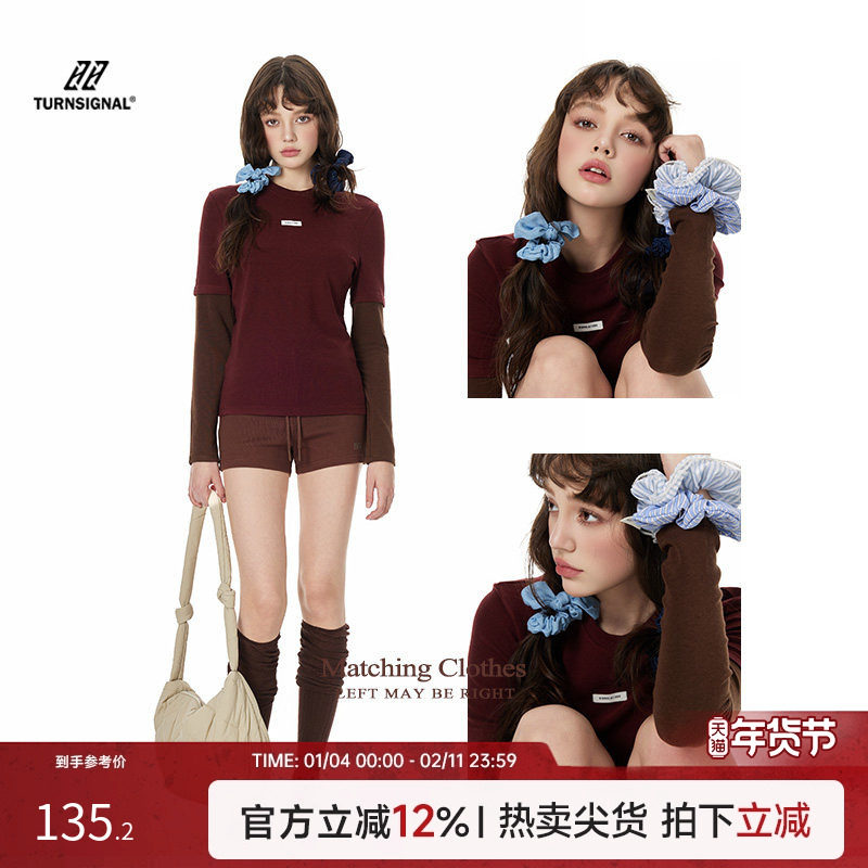 TurnSignal潮牌假两件打底衫女2025新款休闲修身显瘦长袖T恤上衣