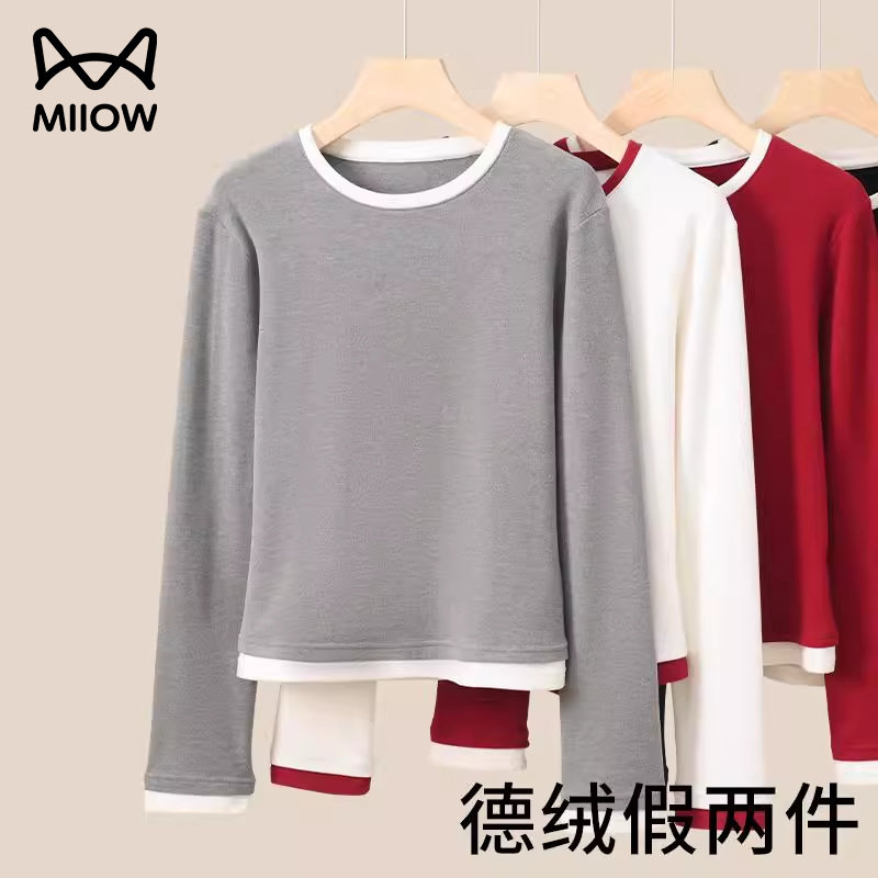 猫人加厚德绒假两件打底衫女2025新款秋冬季保暖发热内搭显瘦上衣