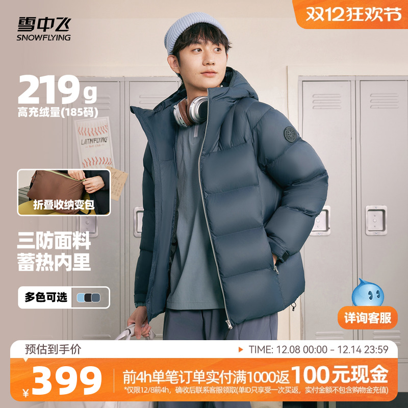 雪中飞2025男士短款户外运动连帽羽绒服多彩面包加厚保暖舒适S