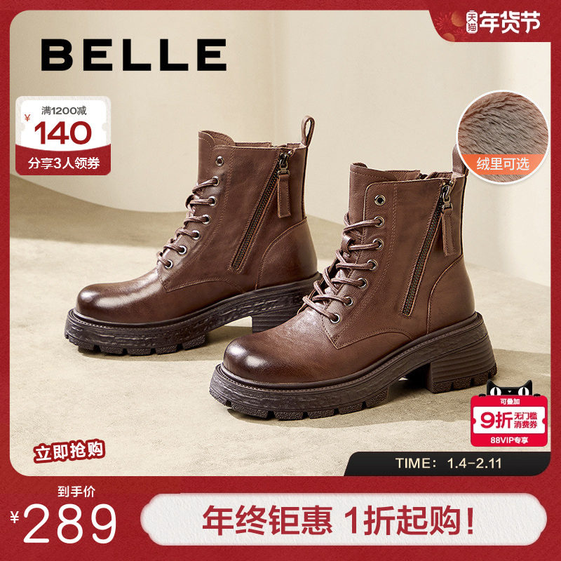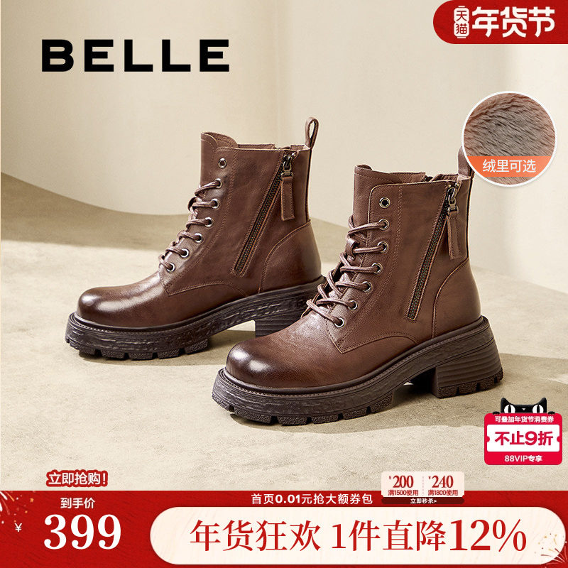 百丽女靴子厚底复古马丁靴加绒新款冬季英伦风真皮短靴D3F1DDD4